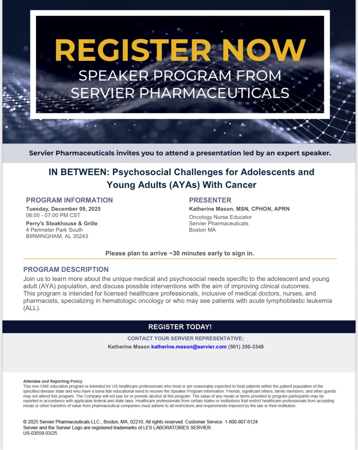 RSVP: To Katherine Mason at 501-350-3348 or katherine.mason@servier.com