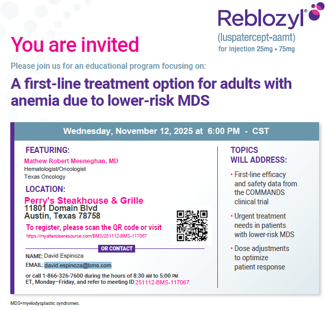 RSVP to David Espinoza at david.espinoza@bms.com. Kindly provide your full name, degree, specialty, address including state, and email address when registering so that you can be confirmed. Alternatively you may scan the QR code provided or use the following link: https://myattendeeresource.com/BMS/251112-BMS-117067