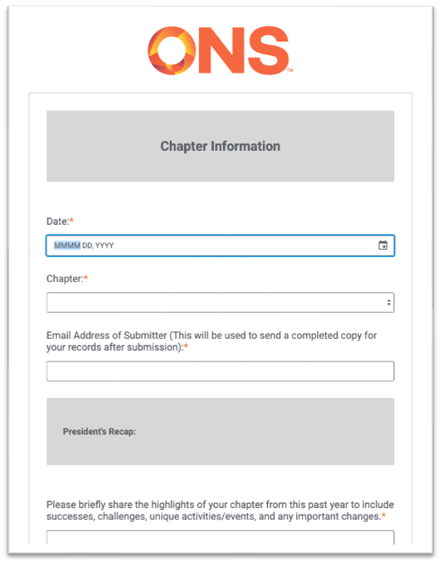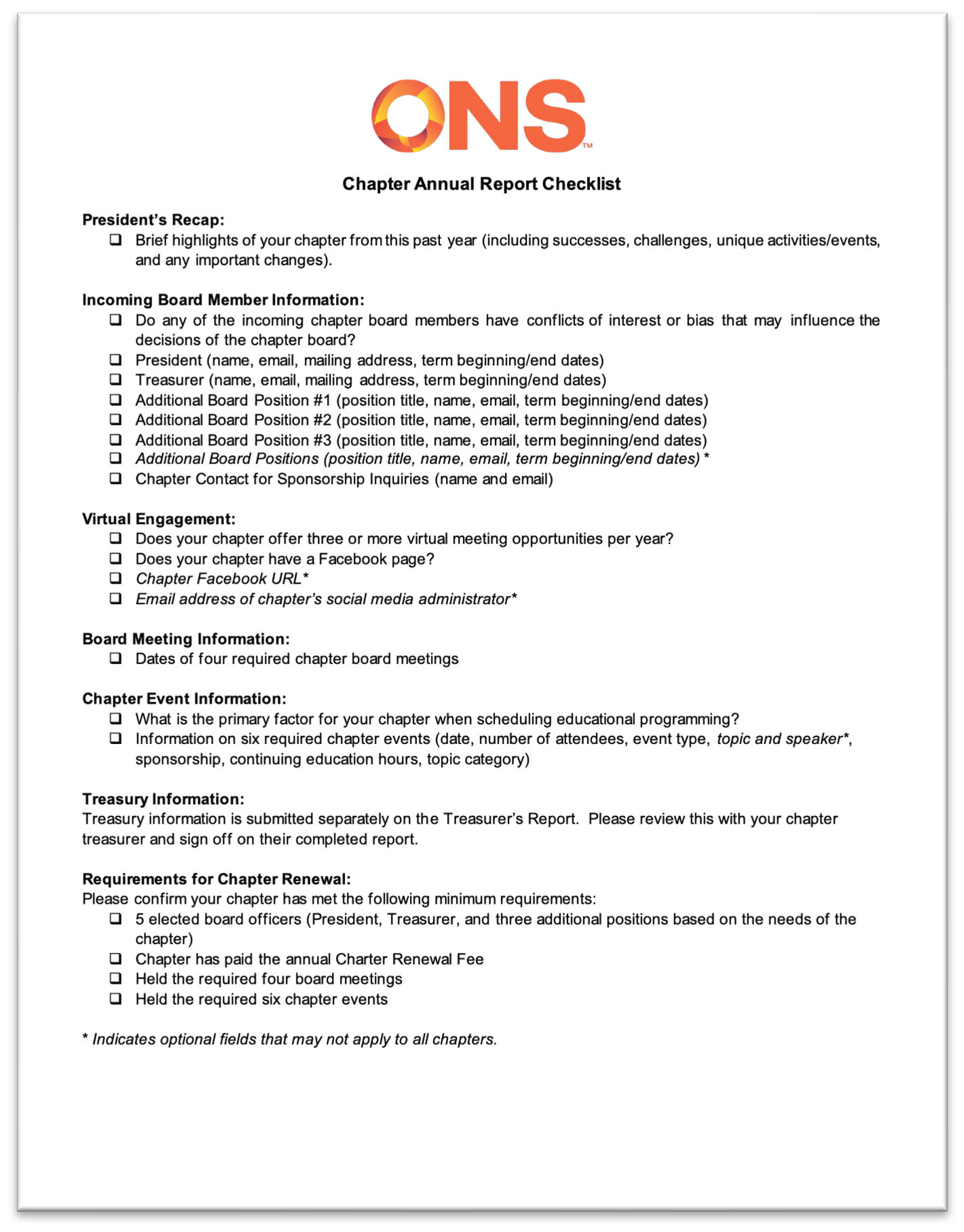 2025 will be the final year of comprehensive annual reporting. The Annual Report (completed by the 2025 chapter president) and the Treasurer Report (completed by the 2025 chapter treasurer) are available below. Additional information for completing the Treasurer Report can be found here.
