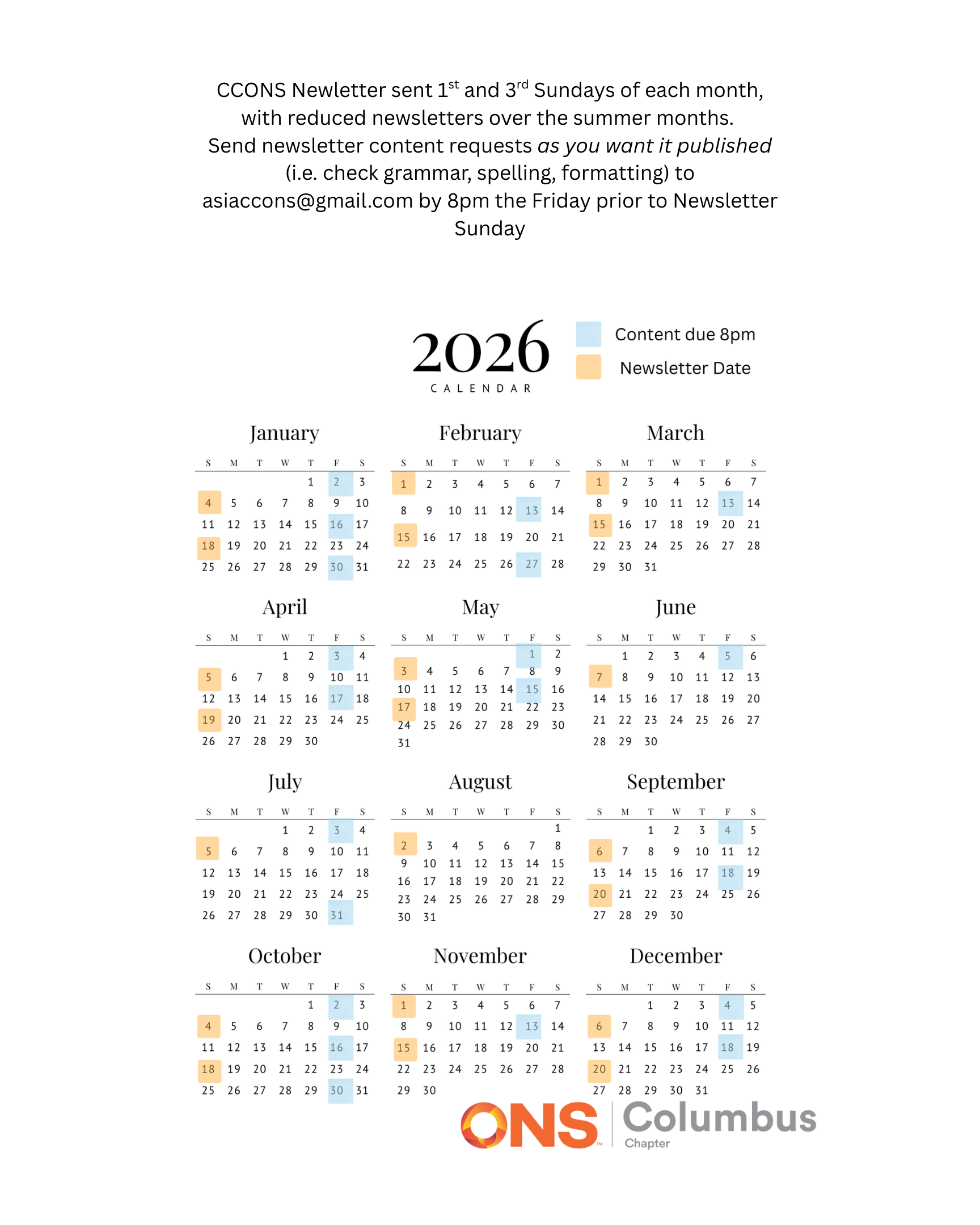 2026 CCONS Newsletter Calendar