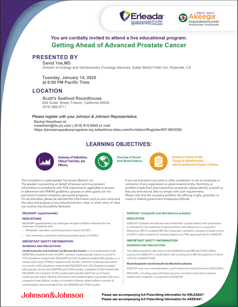 Our first meeting of 2025 will take place on January 14, 2025. Dr. David Yee from Sutter Roseville will present on "Getting Ahead of Advanced Prostate Cancer." The meeting will be held at Scott's Seafood Roundhouse in Folsom. Registration starts at 6 PM, with the presentation beginning at 6:30 PM. We hope you will join us! Reservations can be made using the link below or by contacting Rachel Needham at rneedham@its.jnj.com.