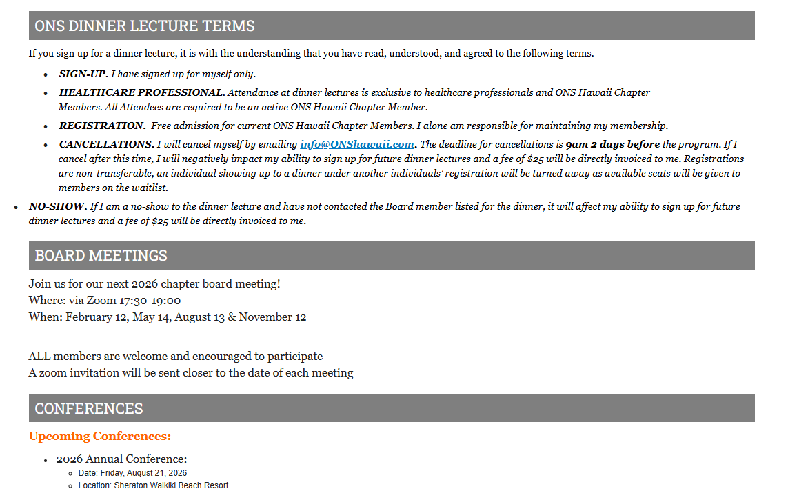 If you haven’t been to one of these dinners recently, they have been great. It’s very worthwhile to come and meet with colleagues you don’t see and work with every day, and to get perspective on the oncology world here in Hawaii. Please joint us if you can, and bring your students and any other APPs who might be interested in the Hawaii ONS.