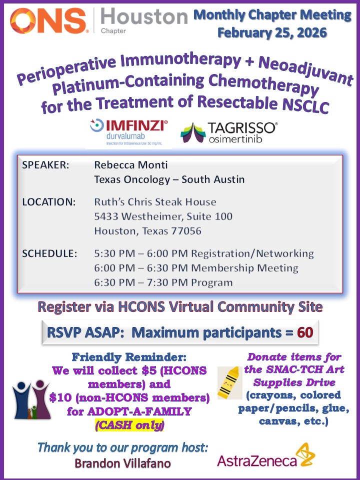 HCONS will be having 2 membership meetings in February (2/18 & 2/25). Please plan to attend only one of the meetings so that we may accommodate more members. If you were able to join us for a January membership meeting, you are not eligible to RSVP for these February meetings so that we may accommodate more HCONS members. We are encouraging attendance every other month to allow additional colleagues to attend.