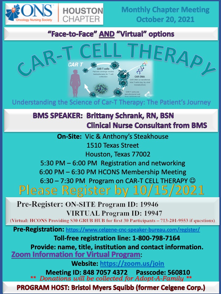 5:30 PM – 6:00 PM Registration and networking6:00 PM – 6:30 PM HCONS Membership Meeting6:30 – 7:30 PM Program on CAR-T CELL THERAPY