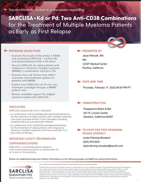 Happy to announce that we will be having our February meeting in-person at Papapavlo’s in Stockton this Thursday, 2/17/22 at 6pm. Please RSVP to Leslie Fleming-Woodard as soon as possible: 1-925-979-8541 or leslie.fleming-woodard@sanofi.com